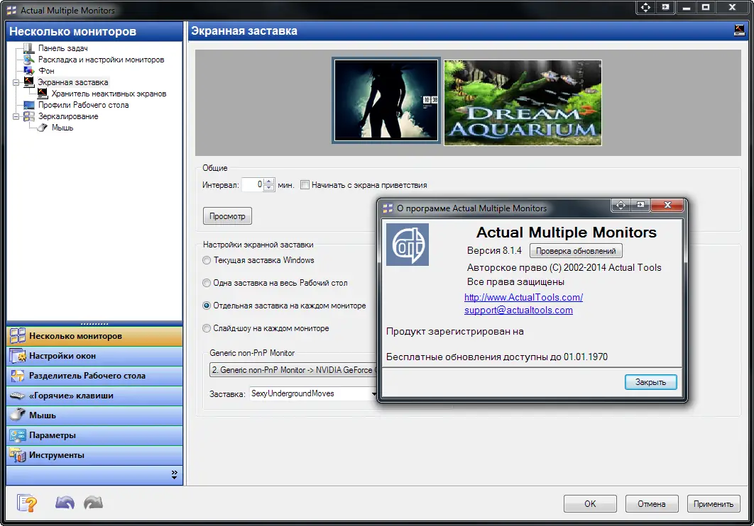 - Поддерживает работу экранной заставки на всех мониторах одновременно, в том числе в расширенном или зеркальном режиме.