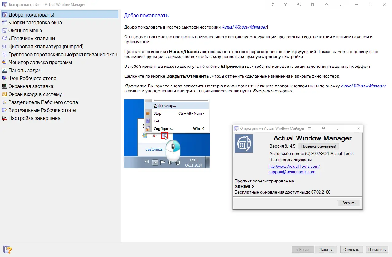 Actual Window Manager — это продвинутая утилита для тонкой настройки оконной системы Windows, объединяющая более 50 инструментов для управления окнами, виртуальными рабочими столами и мультимониторными конфигурациями. Программа автоматизирует повседневные действия, упрощает навигацию и повышает производительность при работе с множеством приложений одновременно.