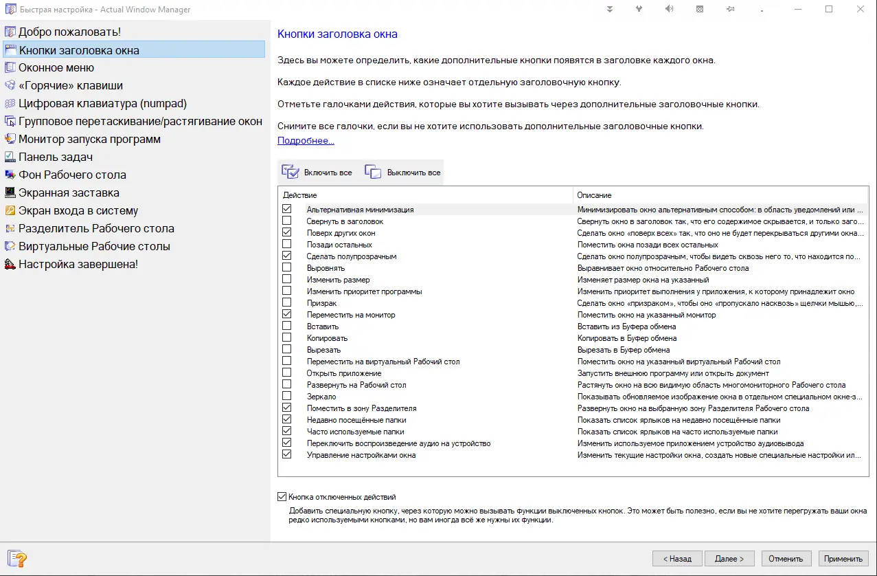- Дополнительные кнопки в заголовке окон для быстрого доступа к функциям вроде сворачивания в область уведомлений или фиксации поверх всех окон