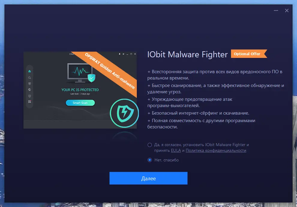 - Включает модуль защиты от шпионского и рекламного программного обеспечения, обновляющийся через облачные технологии.