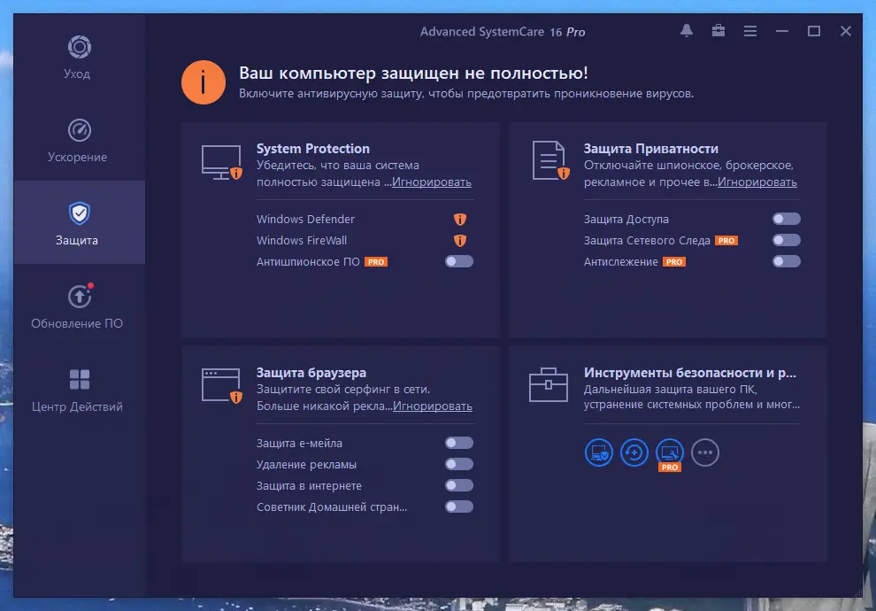 - Встроенные инструменты безопасности сканируют систему на наличие шпионского и рекламного ПО, предотвращая утечку данных и защиту в реальном времени.