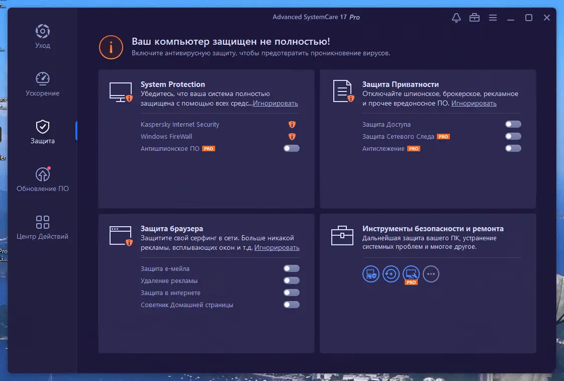 Программа сочетает в себе широкий функционал и простоту использования, что делает её ценным инструментом для повседневного обслуживания ПК. Версия pro обеспечивает расширенные возможности, включая автоматические обновления, продвинутую защиту и облачные технологии для актуализации баз данных. Новая архитектура позволяет ей эффективно работать как на современных, так и на устаревших конфигурациях. Интерфейс переведён на русский язык, а обновлённый код оптимизирован под 32- и 64-битные системы.