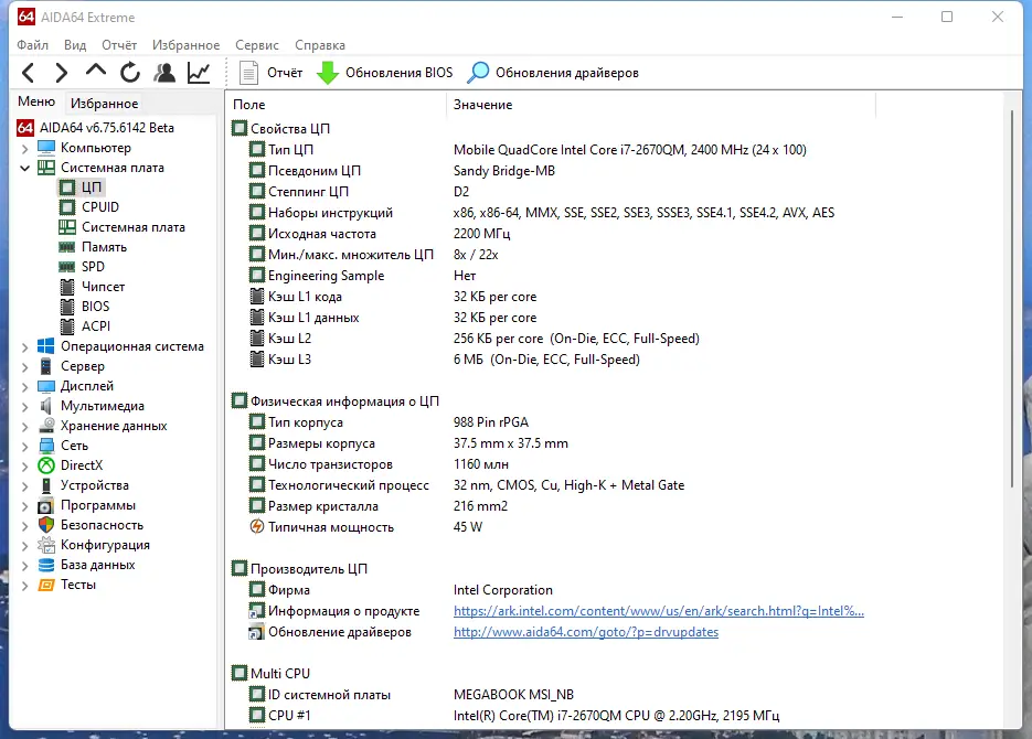 - Отображение точных характеристик процессора, материнской платы и чипсета, включая поддерживаемые технологии и режимы питания.