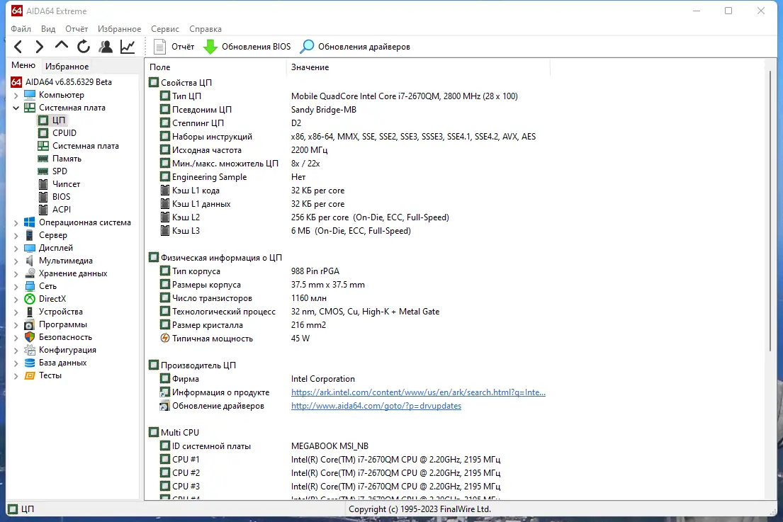 - Отображение детальной информации о центральном процессоре, включая архитектуру, кэш и поддерживаемые инструкции.