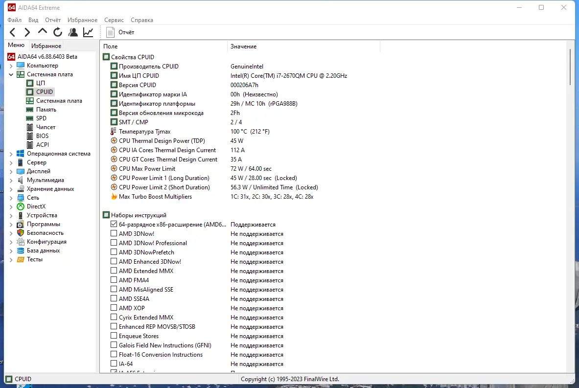 AIDA64 предлагает всесторонний анализ конфигурации компьютера, позволяя получить точные сведения о каждом элементе системы. Программа поддерживает низкоуровневое сканирование, благодаря чему отображает информацию, недоступную стандартным средствам диагностики. Пользователь может ознакомиться с деталями процессора, включая поддерживаемые инструкции, кэш-память и режимы энергопотребления, а также получить данные о материнской плате, чипсете и BIOS.