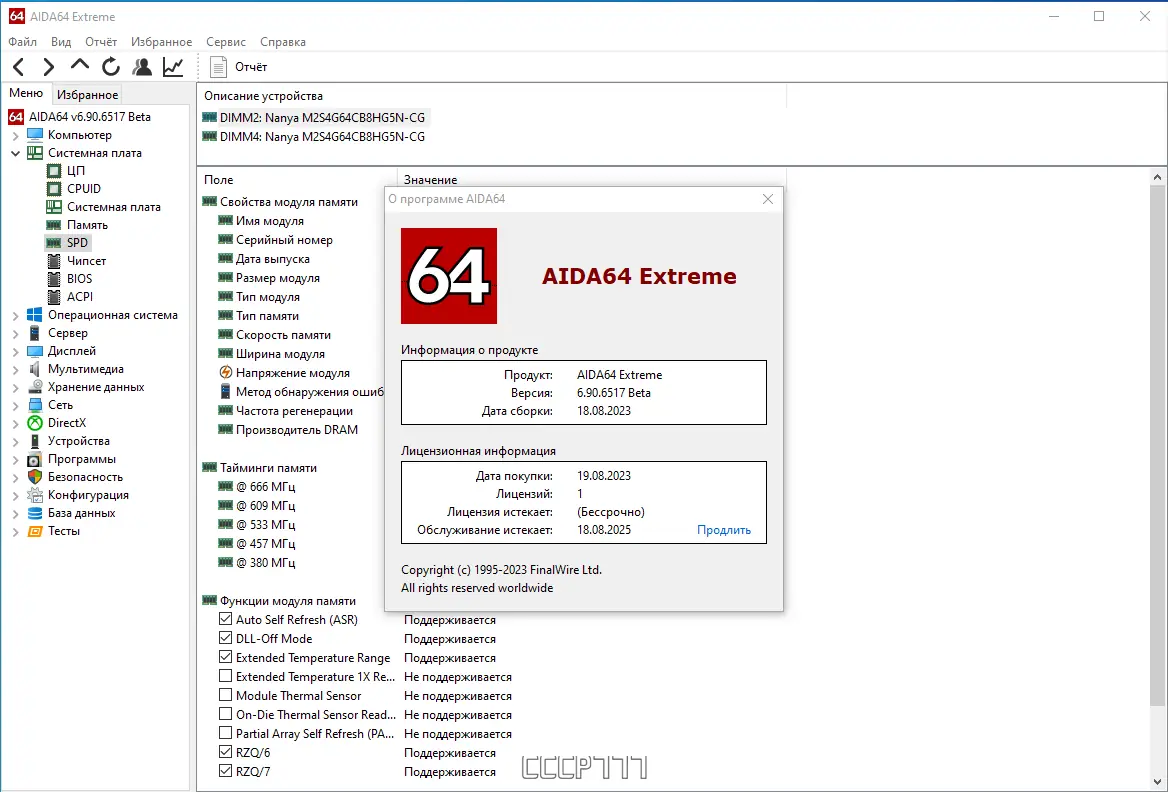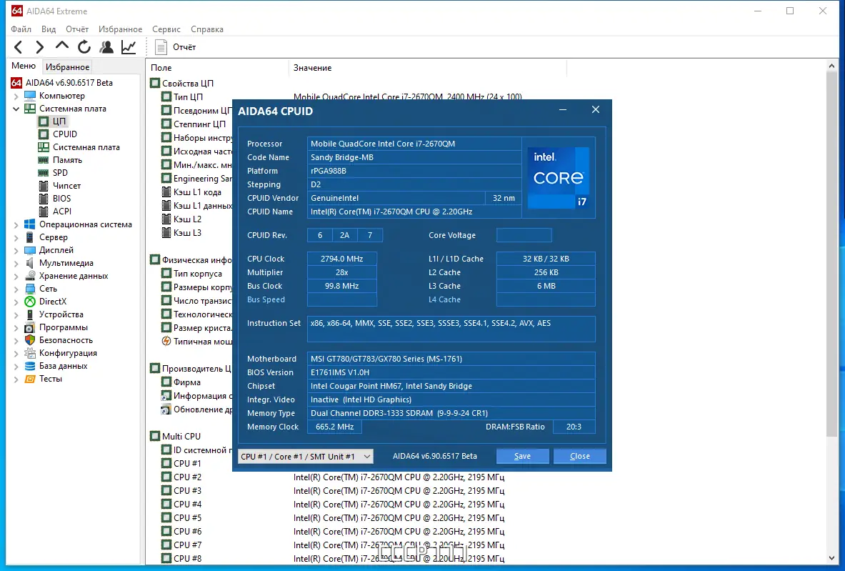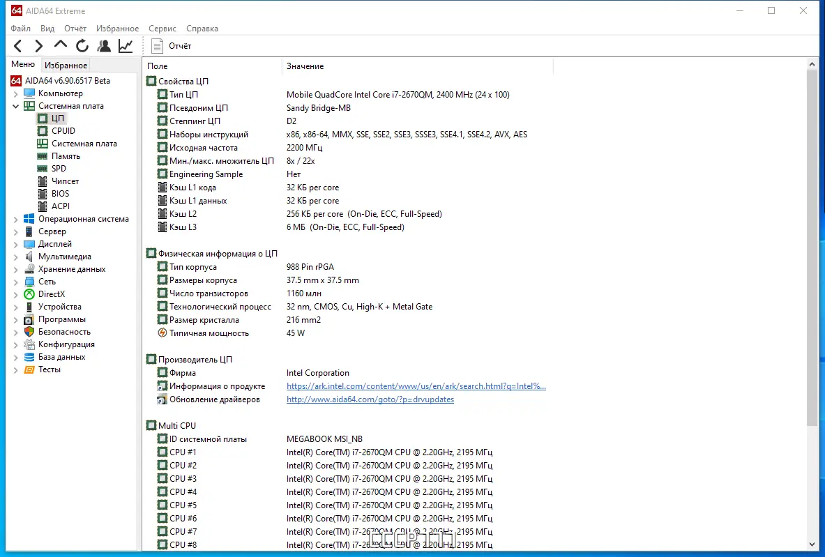 - Отображение детальной информации о центральном процессоре, включая поддержку современных инструкций и режимов работы.