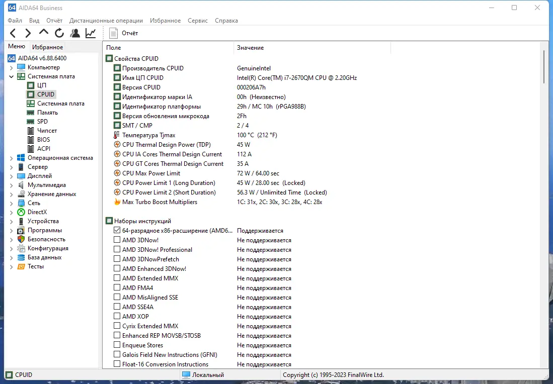 AIDA64 демонстрирует высокий уровень детализации при анализе конфигурации персонального компьютера. Утилита собирает данные на низком уровне, что позволяет получать точную информацию о характеристиках оборудования, включая ревизии чипсетов, версии микропрограмм и параметры датчиков. Пользователь может получить доступ к сведениям о лицензии Windows, дате установки системы, установленных обновлениях и активных сетевых соединениях. Это делает программу незаменимой при аудите компьютеров в корпоративной среде.