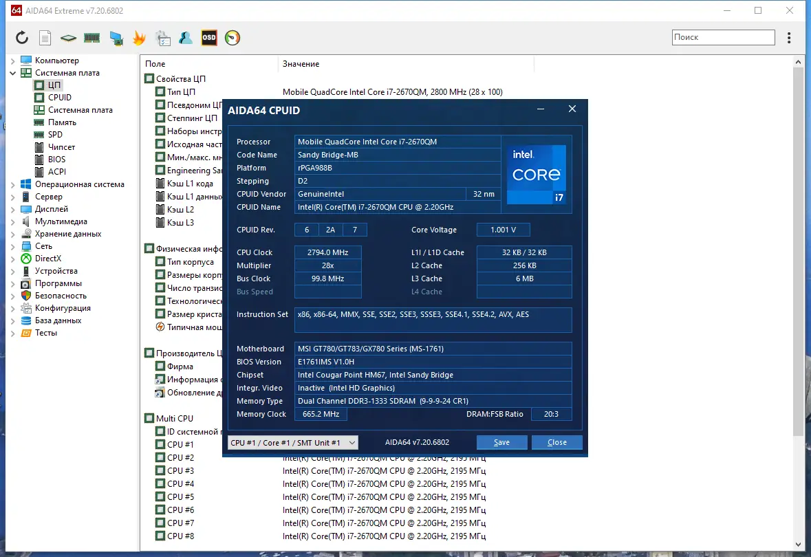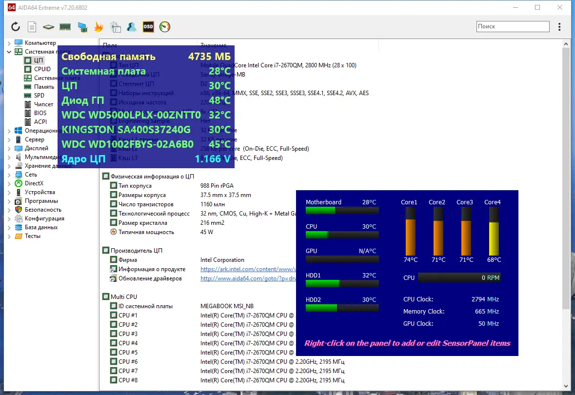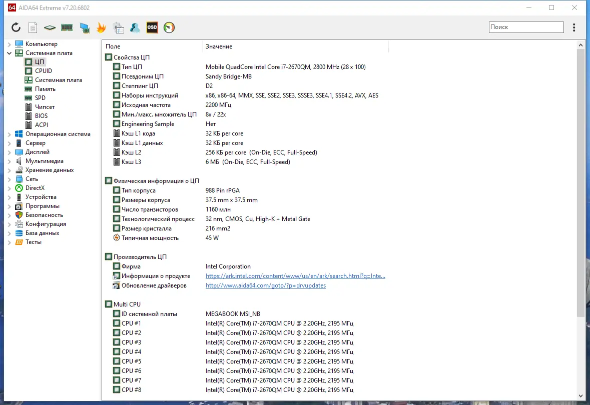 - Позволяет получить точные данные о центральном процессоре, чипсете и материнской плате, включая производителя, модель, разгон и текущие частоты