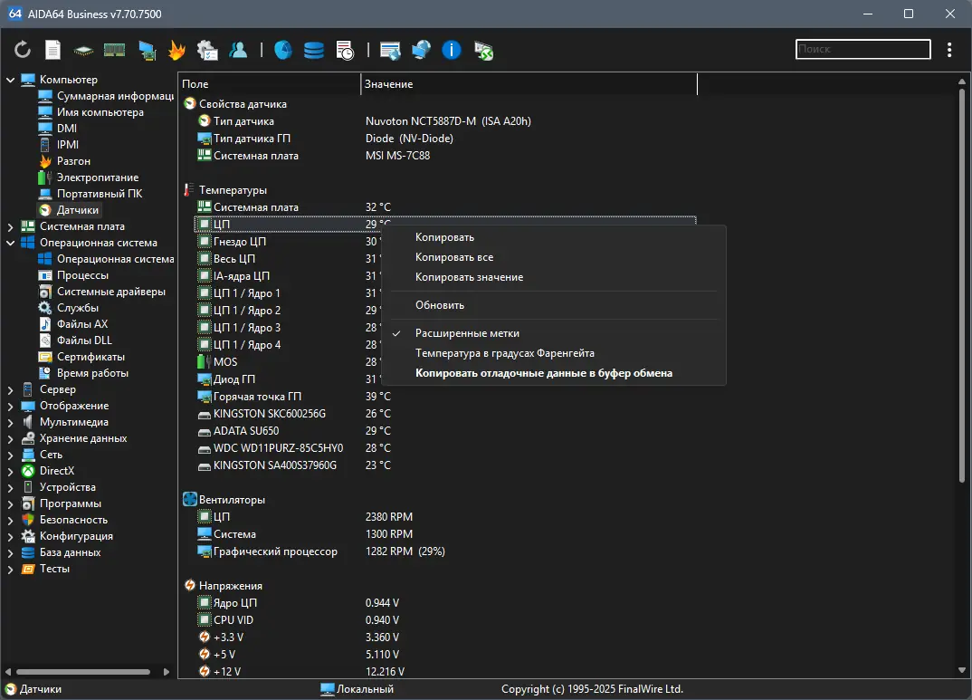 - Мониторинг температуры, напряжения и скорости вращения вентиляторов