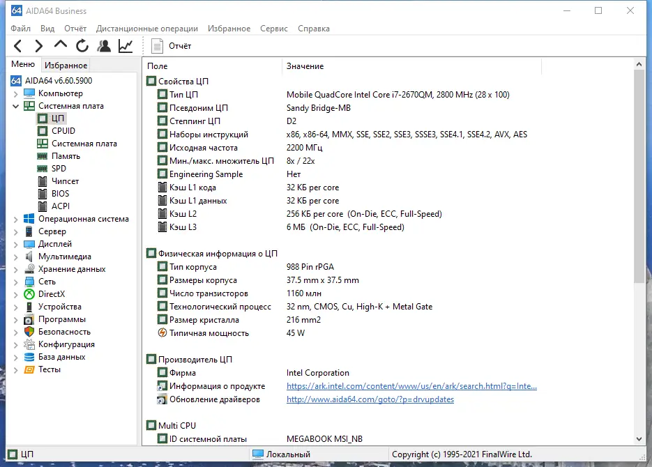 - Предоставляет точные данные о процессоре, материнской плате и чипсете, включая модель, ревизию и поддерживаемые технологии.