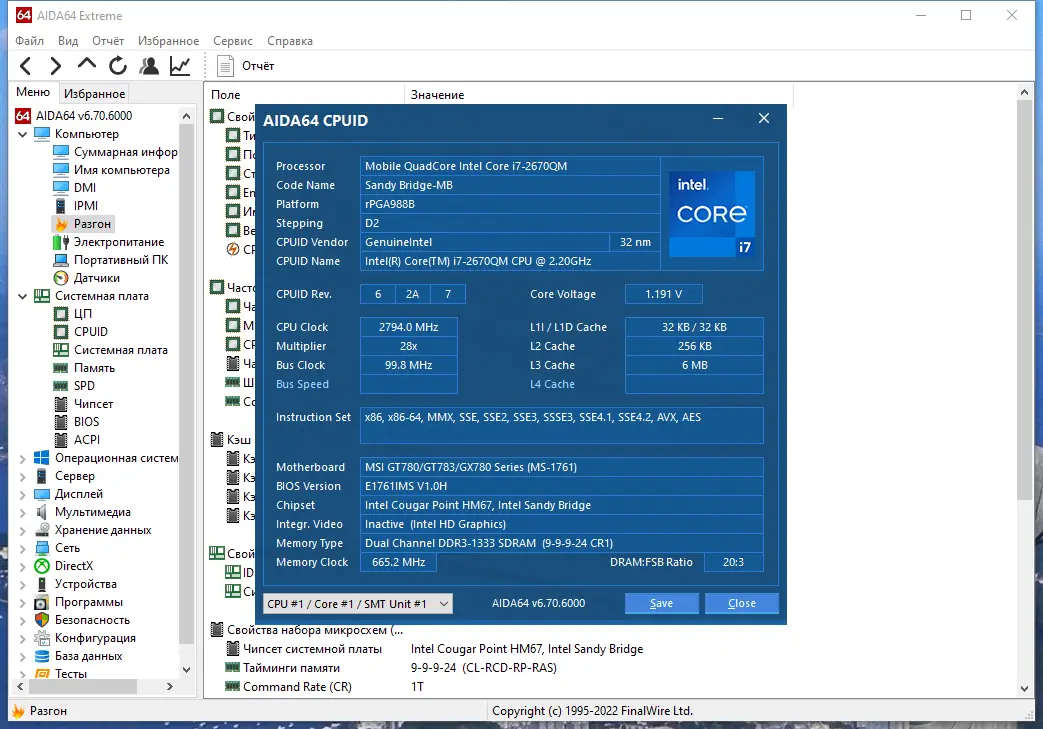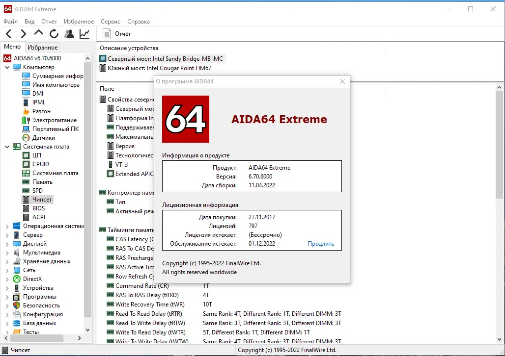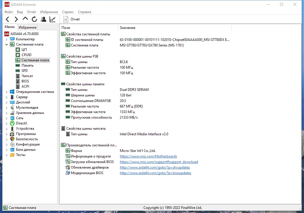 Интерфейс AIDA64 Extreme организован в виде древовидного меню, позволяя быстро переходить между категориями: «Системная доска», «ЦП», «Память», «Сеть», «Программы» и другими. Для получения информации о компонентах достаточно выбрать соответствующий раздел, после чего отобразится подробная таблица с параметрами. Для тестирования производительности доступны встроенные бенчмарки CPU, FPU и памяти, запускаемые через меню «Сервис».