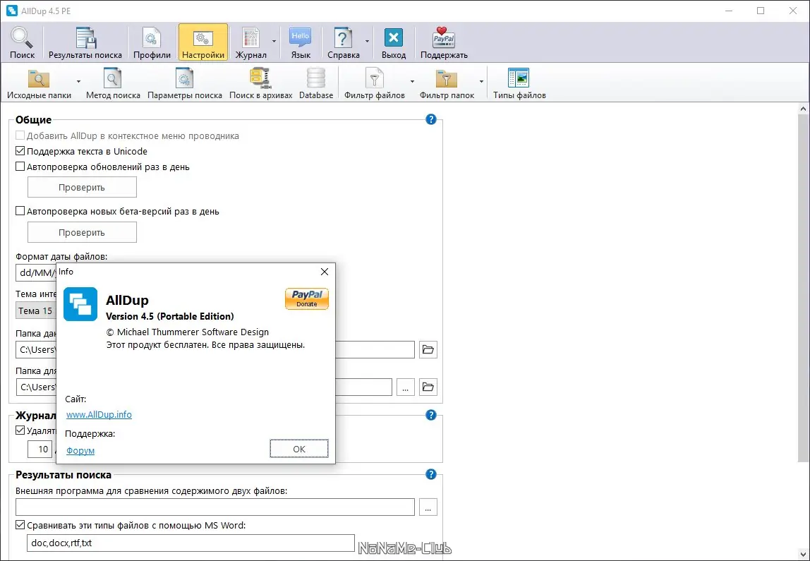 AllDup — это мощная утилита для поиска дубликатов, позволяющая эффективно освобождать дисковое пространство за счёт обнаружения и удаления повторяющихся файлов любого типа. Программа поддерживает комплексный анализ по множеству параметров, включая содержимое, имя, размер и дату изменения, обеспечивая высокую точность результатов.