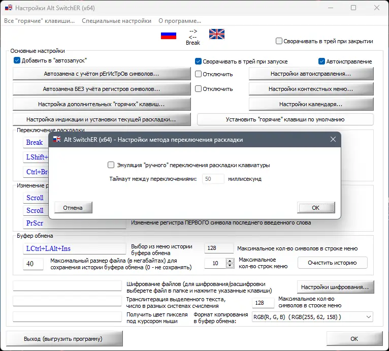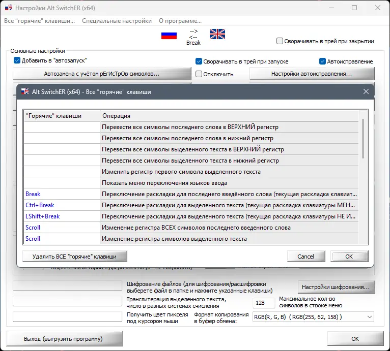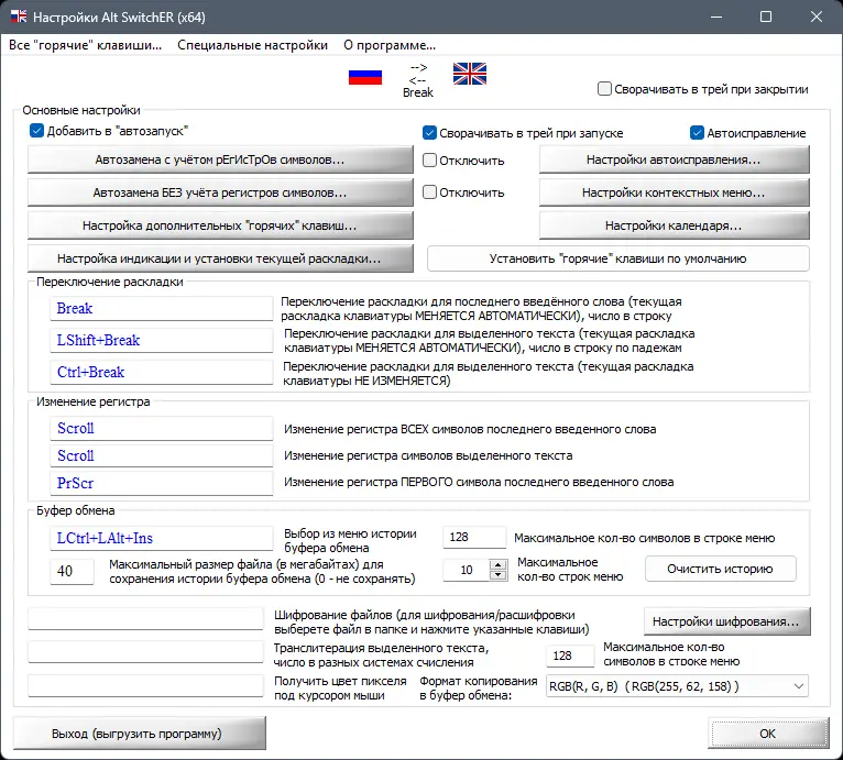 - Автоматическое исправление раскладки в тексте с возможностью исключения отдельных приложений из обработки.