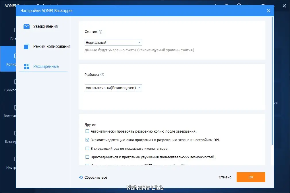 - Возможность шифрования, сжатия и разделения образов резервных копий для дополнительной безопасности и удобства хранения
