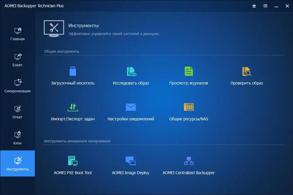 - Поддержка резервного копирования системы, дисков, разделов и отдельных файлов.