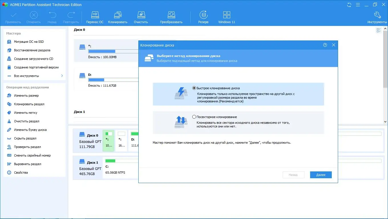- Клонирование диска или отдельных разделов для резервного копирования или замены накопителя.