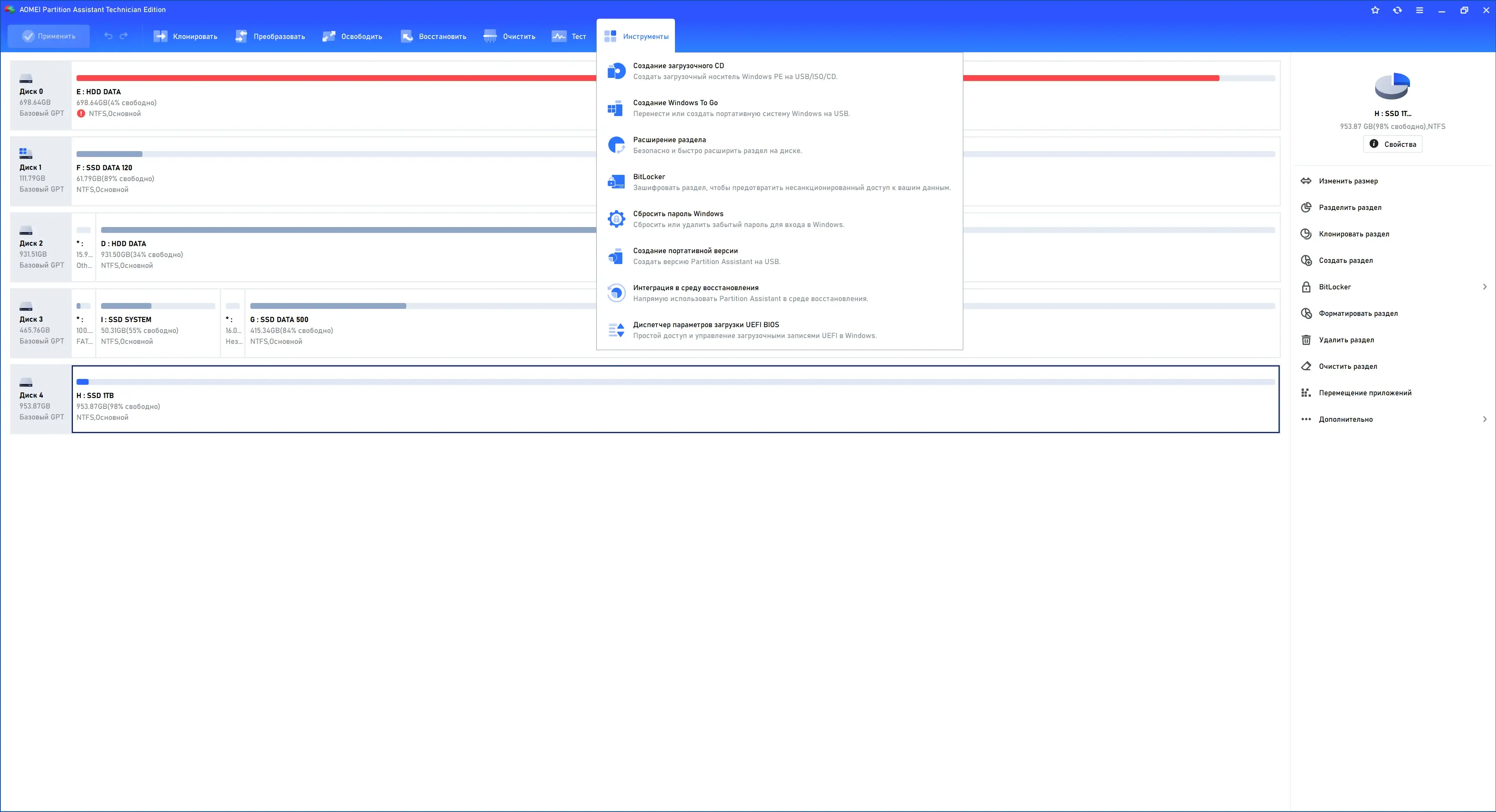Интерфейс утилиты построен по принципу проводника: все диски и разделы отображаются в виде наглядной схемы. Операции выполняются через контекстное меню или панель инструментов — например, можно выбрать раздел, щёлкнуть «Изменить размер» и перетащить границу. Перед применением изменений программа формирует план операций, который можно отредактировать или отменить. Для загрузочных действий доступно создание WinPE-образа, позволяющего управлять дисками до запуска Windows.