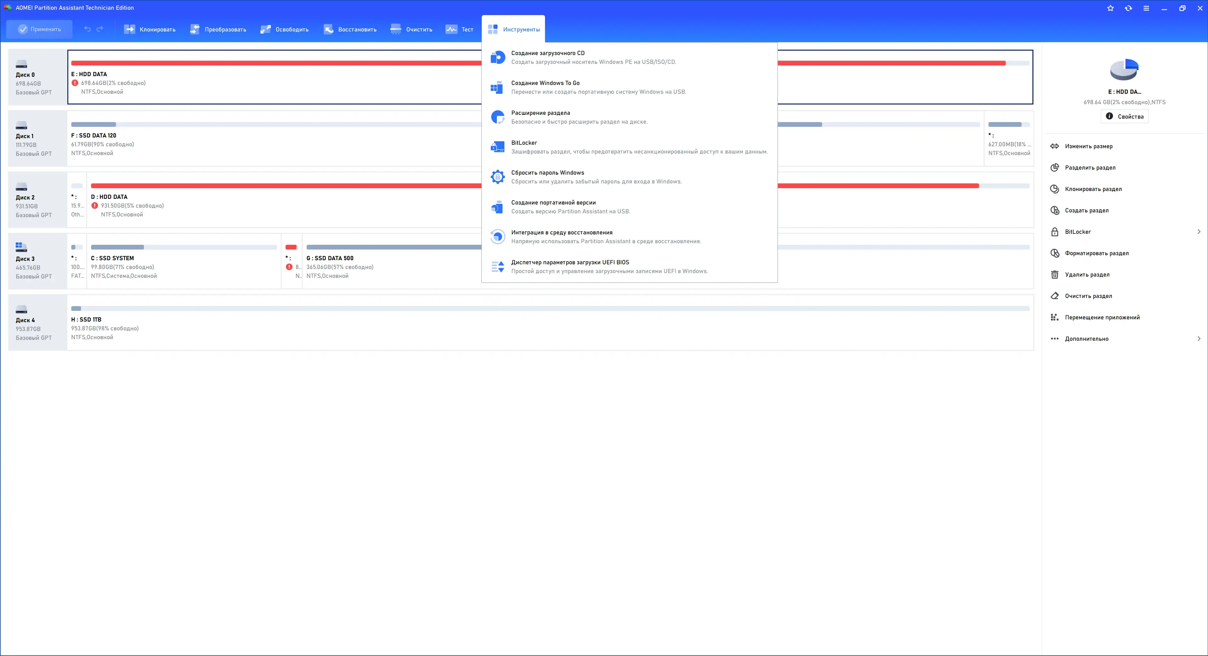Программа представляет собой комплексное решение для управления дисками и разделами на компьютере. Она поддерживает широкий спектр операций, включая изменение размера, перемещение, копирование и форматирование разделов. Интерфейс интуитивно понятен, а встроенные мастеры помогают выполнять сложные задачи даже новичкам. Утилита совместима с различными типами дисков, включая SSD, HDD и динамические тома.