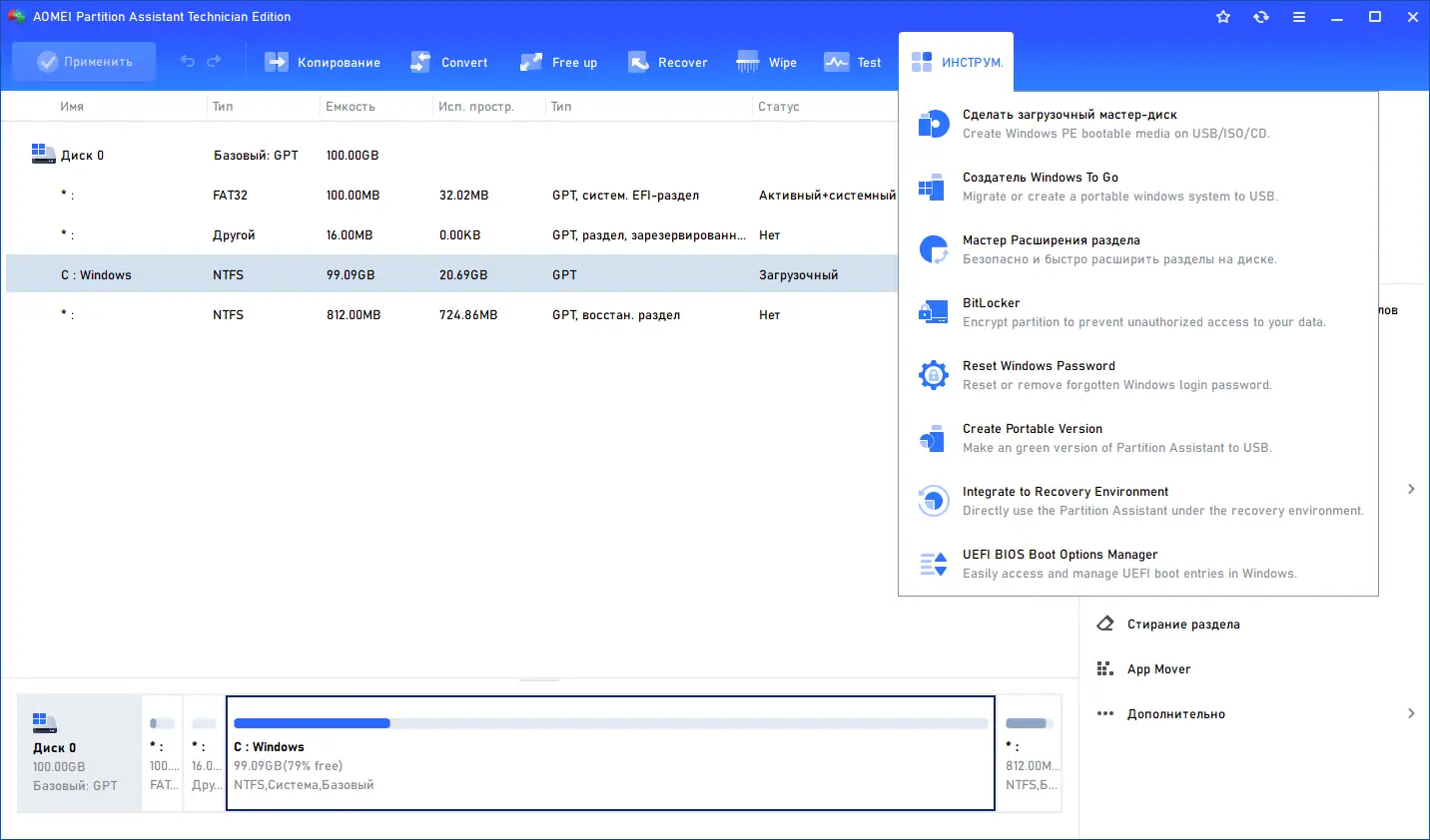 Программа AOMEI Partition Assistant предназначена для управления разделами жёстких дисков и SSD, обеспечивая расширение, слияние, клонирование и восстановление разделов без потери данных. Инструмент поддерживает работу с системными дисками, включая миграцию ОС на SSD, преобразование между GPT и MBR, а также управление динамическими томами. Решение подходит как для домашних пользователей, так и для системных администраторов, требующих надёжного контроля над дисковым пространством.