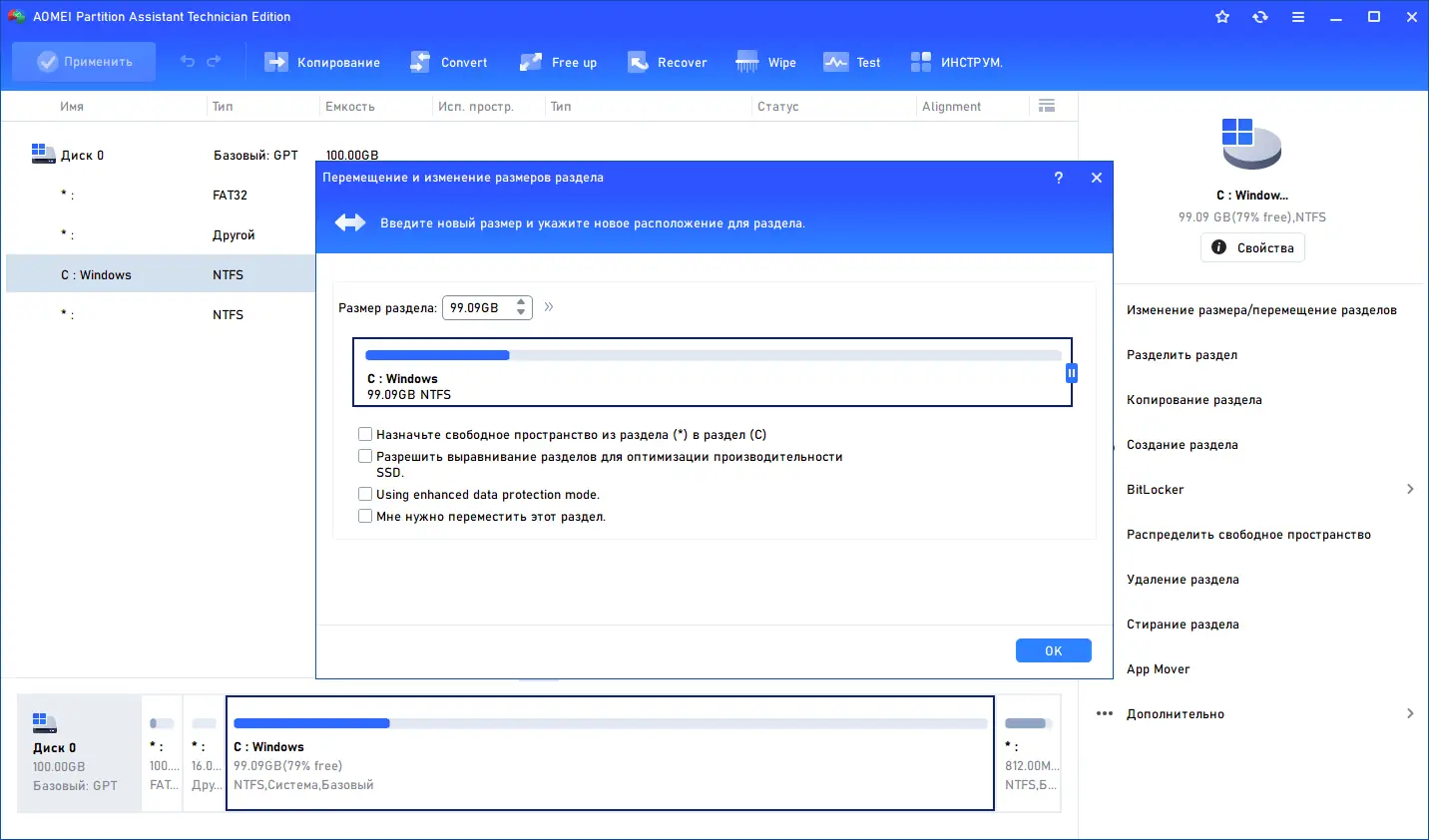 Использование AOMEI Partition Assistant не требует глубоких технических знаний. После запуска программы отображается графическое представление всех подключённых дисков и их разделов. Пользователь может выбрать нужный раздел и через контекстное меню выполнить требуемую операцию — изменить размер, объединить, скопировать или отформатировать. Перед применением изменений система предлагает предварительный просмотр, что исключает случайные ошибки. Большинство операций выполняется в фоновом режиме без перезагрузки, особенно при расширении системного раздела NTFS.