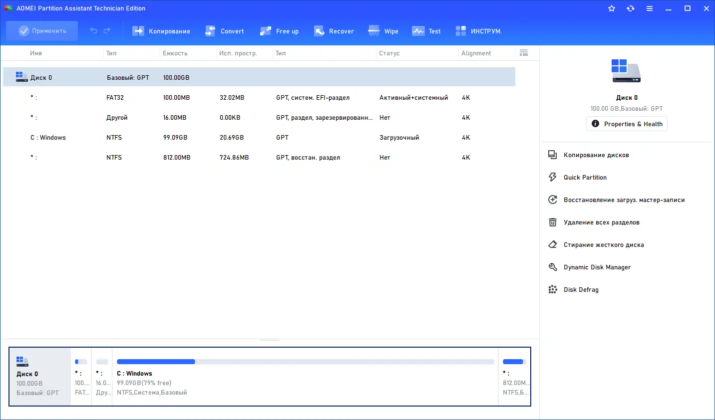 AOMEI Partition Assistant — это многофункциональная утилита, разработанная для комплексного управления дисками и разделами в операционных системах Windows. Программа позволяет эффективно оптимизировать структуру хранения данных, улучшать производительность дисков и восстанавливать утерянные разделы. В её арсенале — как базовые операции, такие как создание и форматирование разделов, так и продвинутые функции, включая клонирование дисков и миграцию операционной системы.