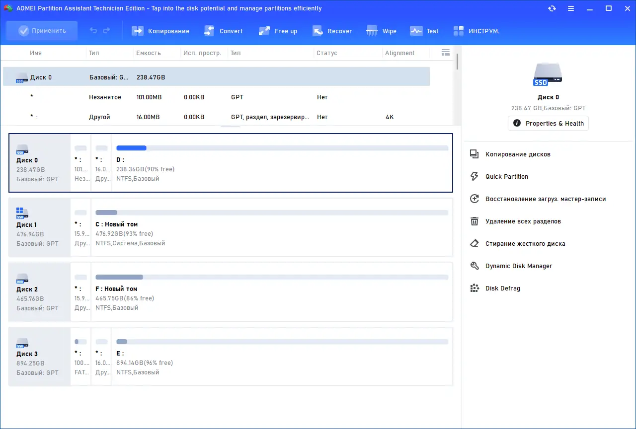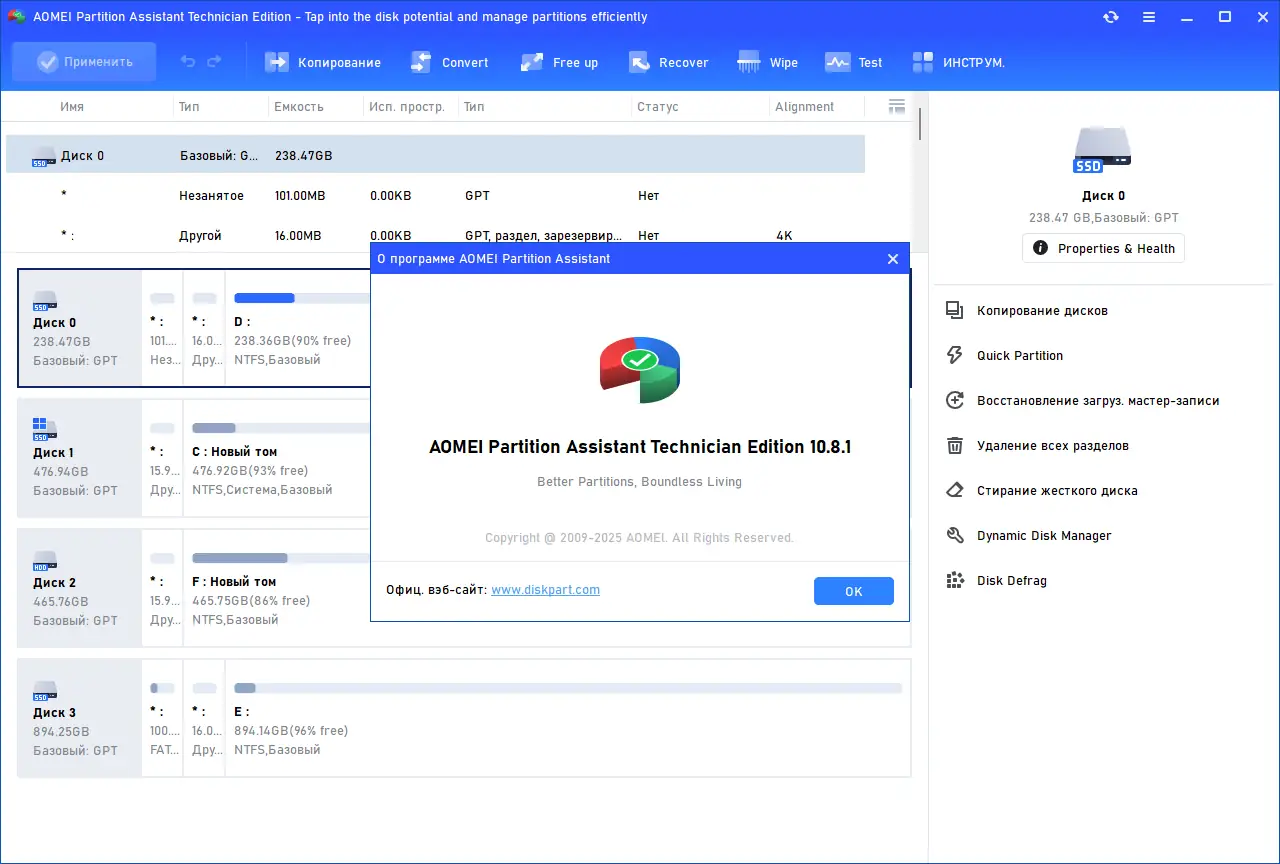 AOMEI Partition Assistant представляет собой комплексное решение для управления жёсткими дисками и твердотельными накопителями. Она поддерживает как базовые, так и расширенные операции с разделами, позволяя пользователям гибко настраивать структуру дискового пространства под свои нужды. Программа совместима с различными типами дисков, включая MBR и GPT, и работает с файловыми системами NTFS, FAT32, Ext2/Ext3 и другими. Благодаря встроенному менеджеру динамических томов, пользователи могут управлять сложными конфигурациями без необходимости перезагрузки системы. Это делает её незаменимой как для домашних пользователей, так и для системных администраторов.