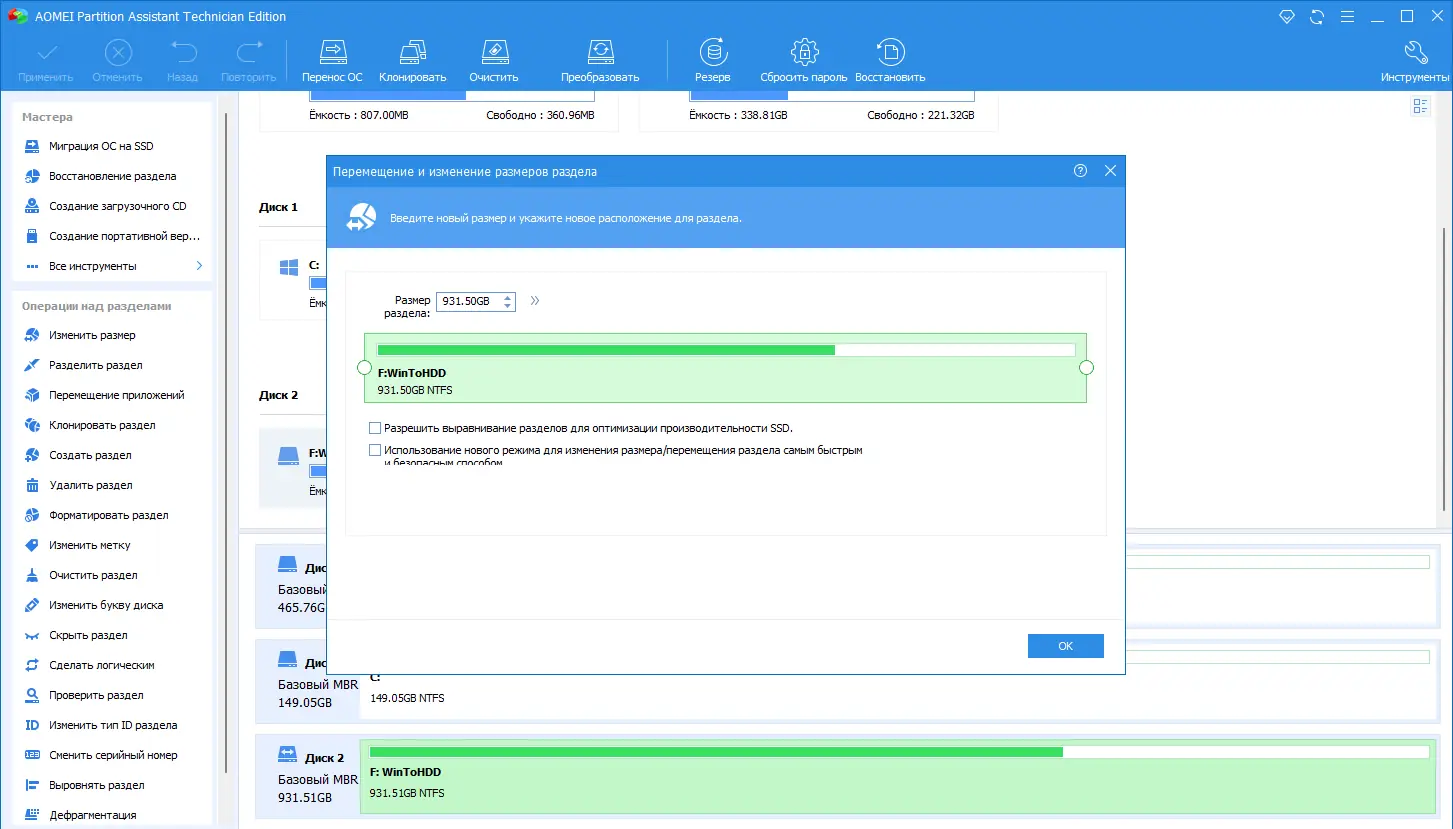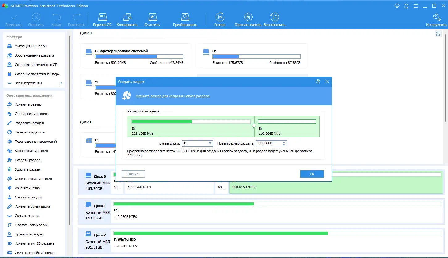 - Создание новых разделов независимо от текущего распределения дискового пространства, что особенно полезно при нехватке места на системном диске.