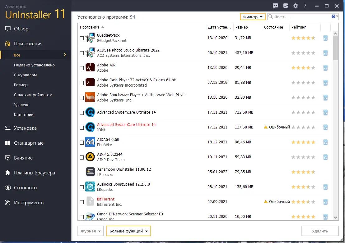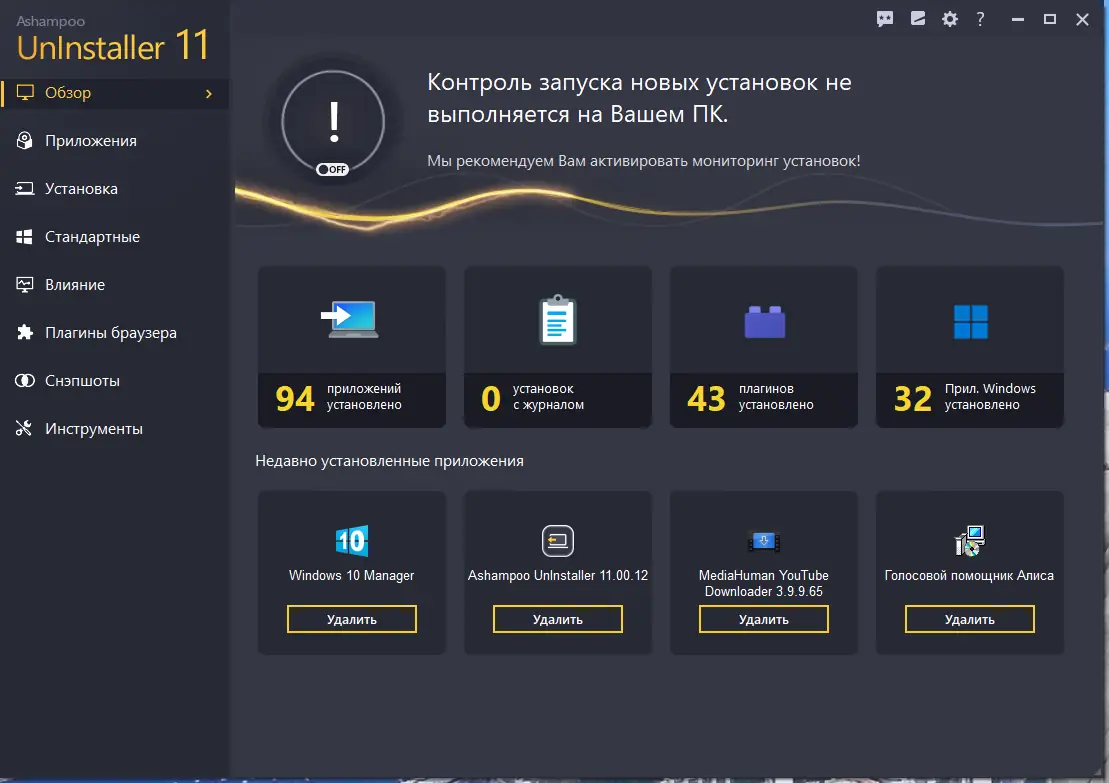 Ashampoo UnInstaller — это мощная утилита для полного и безопасного удаления программ, остатков установок, расширений браузеров и вредоносных компонентов. Программа контролирует каждую установку в системе, создавая детальные снимки до и после изменений, что позволяет в любой момент полностью отменить инсталляцию. Благодаря технологии глубокой очистки и эвристическому анализу поведения установщиков, утилита удаляет даже те файлы и записи в реестре, которые стандартные деинсталляторы оставляют. Подходит для пользователей, стремящихся поддерживать чистоту и производительность системы.