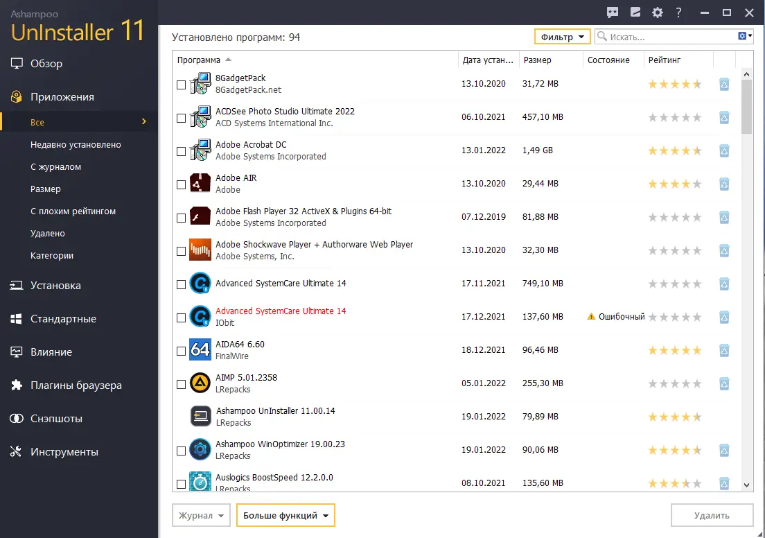 Работа с Ashampoo UnInstaller