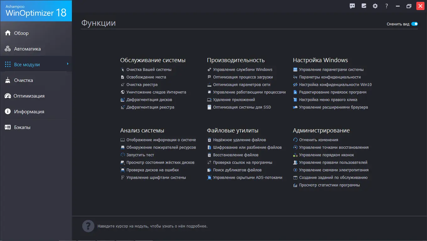 Ashampoo WinOptimizer — это комплексный инструмент для оптимизации производительности компьютера под управлением Windows. Программа объединяет десятки утилит, направленных на очистку системы, повышение скорости работы, защиту конфиденциальности и тонкую настройку операционной среды. Благодаря интуитивному интерфейсу и широкому функционалу, она подходит как новичкам, так и опытным пользователям, стремящимся продлить ресурс оборудования и улучшить отклик системы.