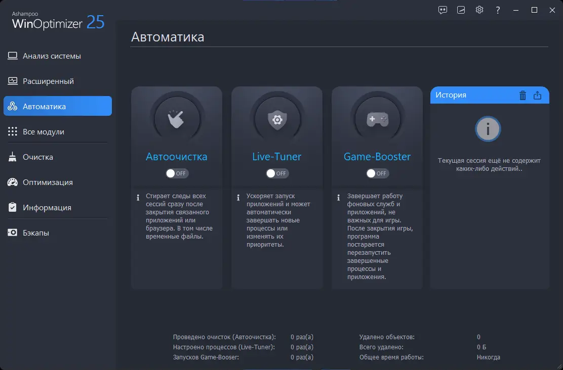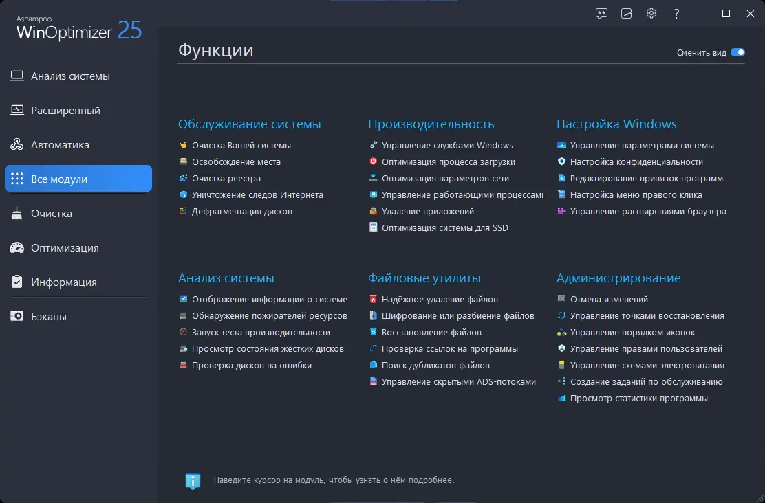 Ashampoo WinOptimizer 25 — это универсальный инструмент для обслуживания и оптимизации операционной системы Windows. Она сочетает в себе более тридцати модулей, отвечающих за очистку дисков, восстановление реестра, управление автозагрузкой, защиту конфиденциальности и настройку скрытых параметров системы. Программа ориентирована на пользователей, которые хотят поддерживать компьютер в идеальном состоянии без необходимости вникать в технические детали. При этом она предоставляет профессионалам расширенные возможности для тонкой настройки.