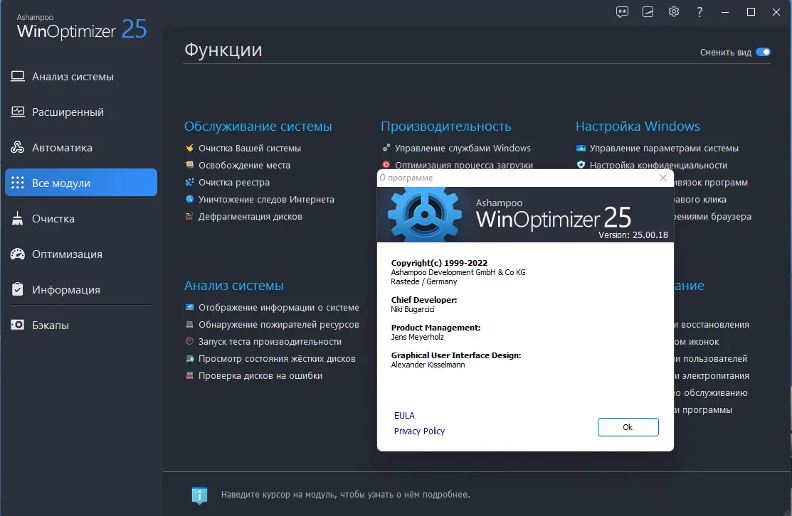 Ashampoo WinOptimizer — это комплексная утилита для оптимизации операционной системы Windows, разработанная с учётом современных требований к производительности, безопасности и удобству. Программа объединяет более тридцати инструментов, охватывающих все аспекты обслуживания системы: от очистки дисков и реестра до управления автозагрузкой, браузерными расширениями и конфиденциальностью. Она поддерживает Windows 7, 8.1, 10 и 11, обеспечивая стабильную работу на различных конфигурациях. Интерфейс адаптирован под современные стандарты, включая поддержку высоких разрешений и функций вроде Aero Snap. Программа подходит как для новичков, так и для продвинутых пользователей, предлагая как автоматические режимы, так и тонкие настройки вручную.