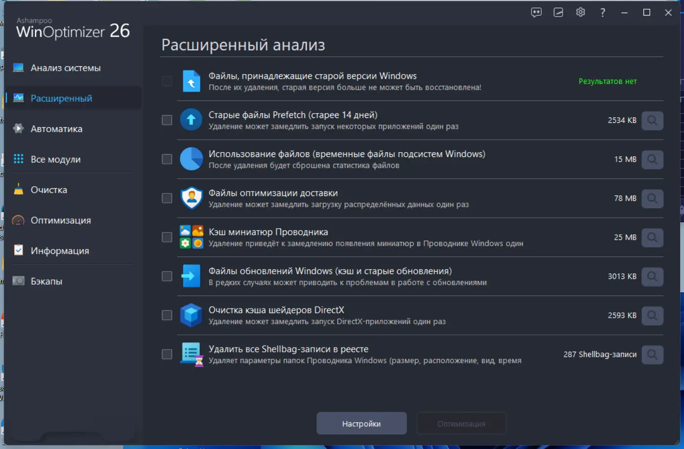 - Углублённая очистка дисков, включая удаление старых резервных копий Windows и кэша приложений