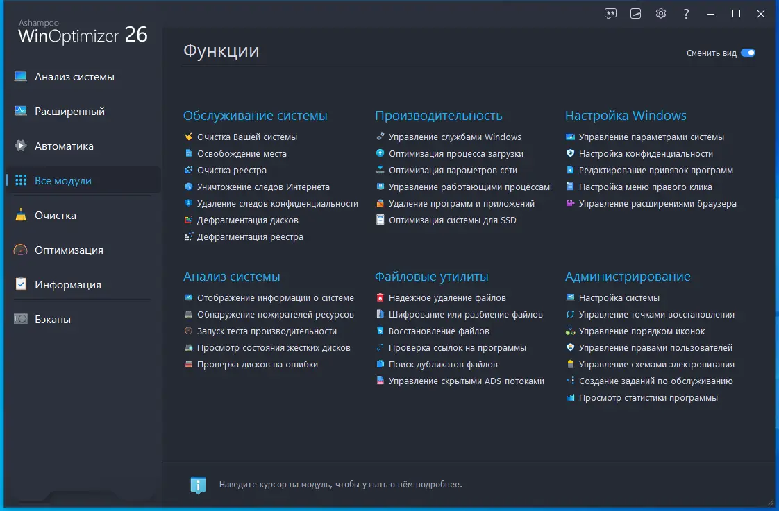 Ashampoo WinOptimizer — это комплексный инструмент для тонкой настройки, очистки и повышения производительности операционной системы Windows. Программа объединяет более 80 модулей, направленных на оптимизацию работы ПК, безопасное удаление данных, шифрование файлов и улучшение стабильности системы. Благодаря интуитивному интерфейсу и широкому функционалу, она подходит как новичкам, так и продвинутым пользователям.