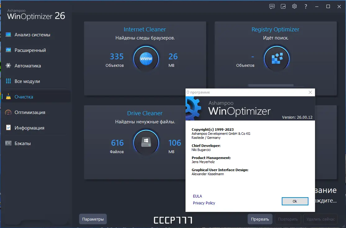 - Глубокая очистка системы от временных файлов, кэшей браузеров, остатков удалённых программ и резервных копий обновлений Windows.