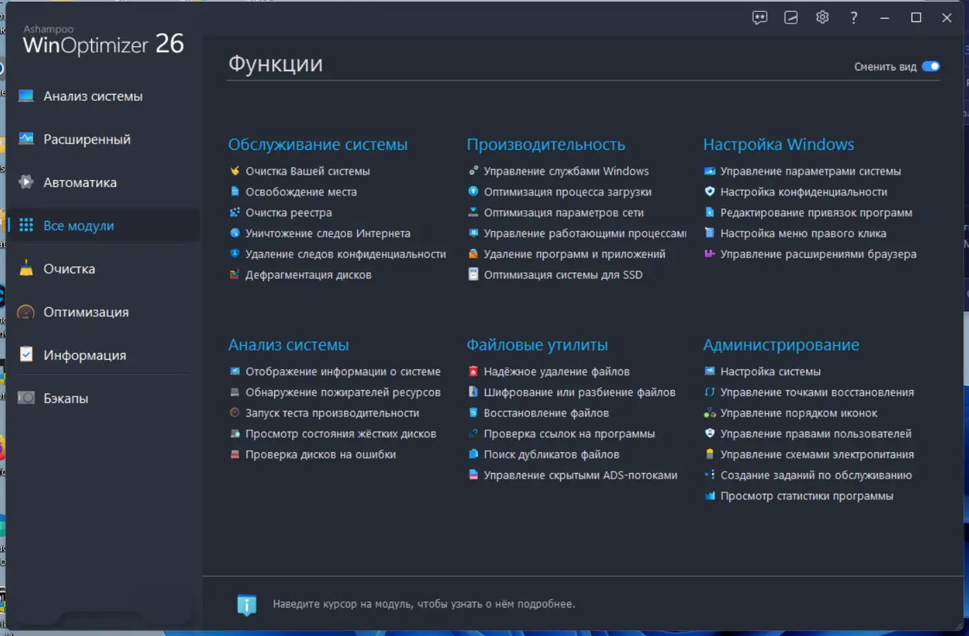 Ashampoo WinOptimizer представляет собой многофункциональную утилиту, предназначенную для комплексной оптимизации операционной среды Windows. Она включает в себя более тридцати инструментов, охватывающих все аспекты обслуживания системы — от очистки дисков и реестра до управления автозагрузкой, приватностью и производительностью. Программа регулярно обновляется, чтобы оставаться совместимой с новыми версиями Windows, включая 7, 10 и 11, а также учитывать особенности современных процессоров, SSD и браузеров. Её основная цель — предотвратить деградацию производительности со временем и вернуть ПК в состояние, близкое к «из коробки».