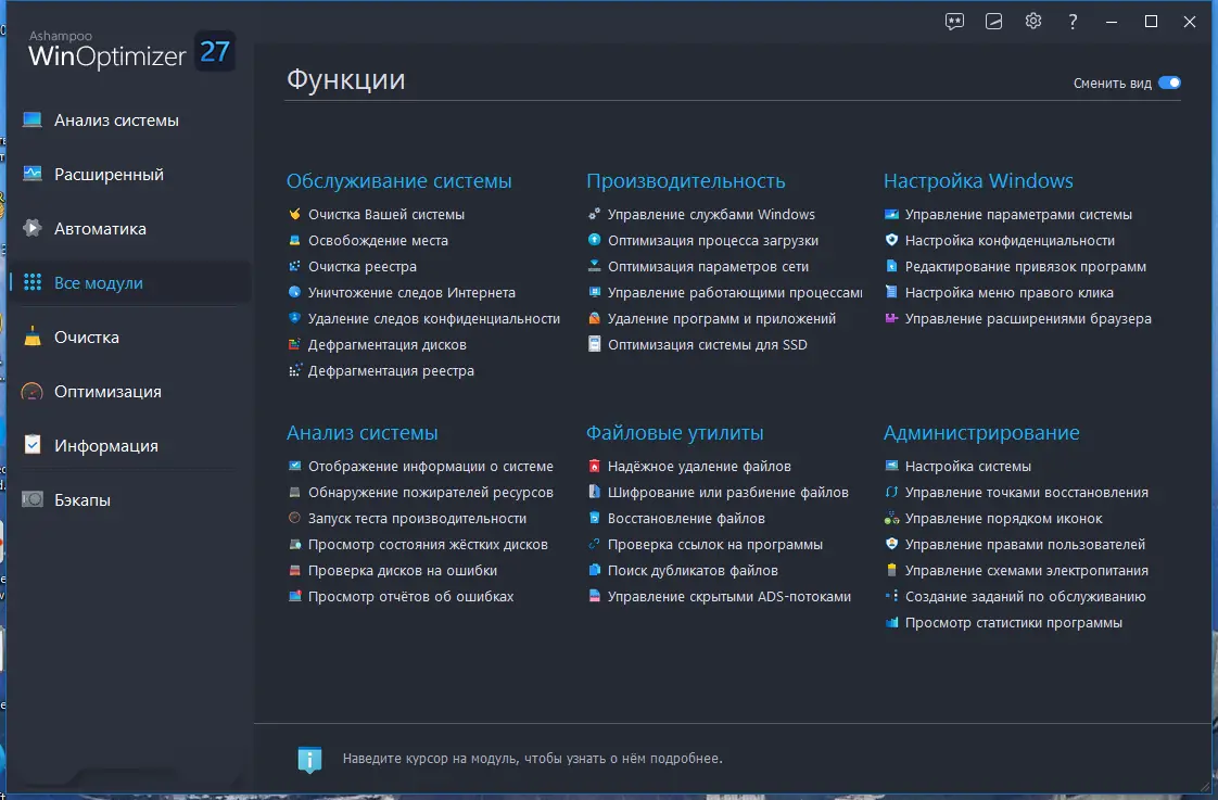 Ashampoo WinOptimizer 27 — это комплексная утилита для тонкой настройки, очистки и ускорения работы операционной системы Windows. Программа эффективно устраняет системный мусор, оптимизирует реестр, повышает производительность и защищает конфиденциальность пользователей. С обновлённым интерфейсом, поддержкой Windows 11 и более чем 30 встроенными инструментами, она становится незаменимым помощником для поддержания ПК в идеальном состоянии.