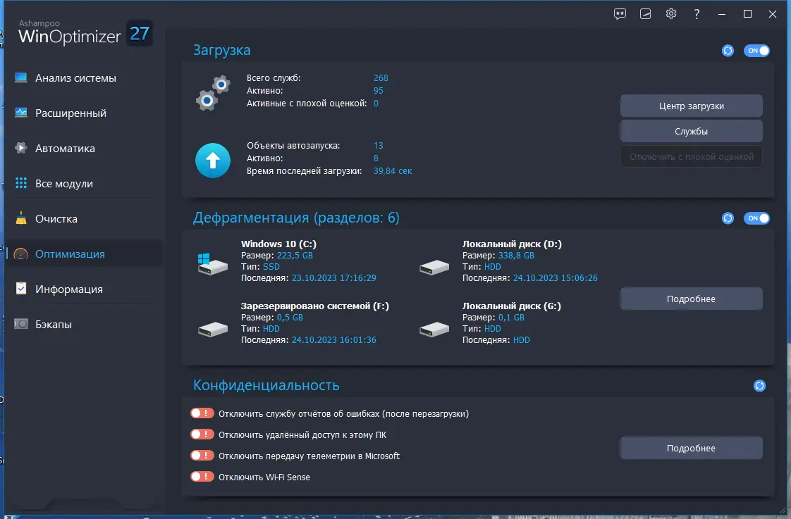- Оптимизирует автозагрузку, реестр и фоновые службы для ускорения работы ПК