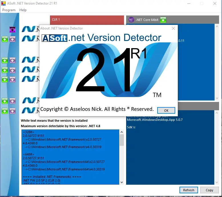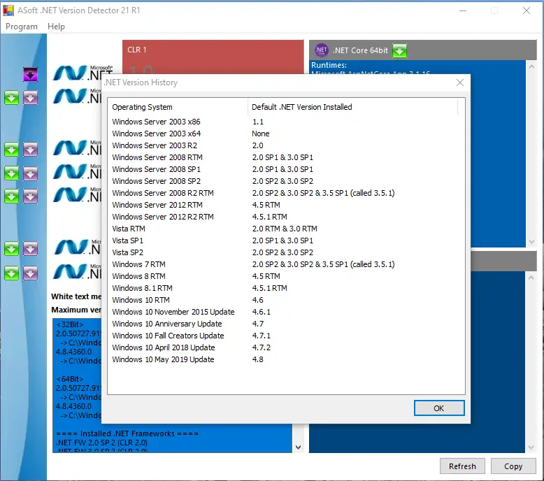 ASoft.NET Version Detector — это компактная утилита для определения установленных на компьютере версий .NET Framework и .NET Core. Программа отображает доступные и отсутствующие компоненты, помогает перейти к официальным установщикам и открывает папки с уже интегрированными сборками.