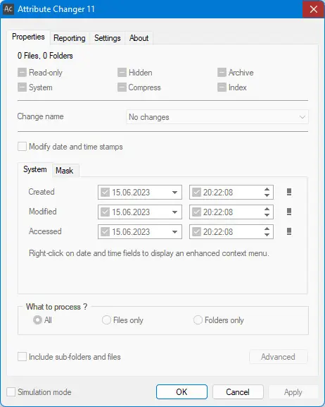 Attribute Changer — это компактная системная утилита для быстрого и удобного изменения атрибутов файлов и папок в операционной системе Windows. Программа интегрируется в контекстное меню проводника, позволяя напрямую с помощью одного клика изменять свойства элементов. Поддерживаются такие атрибуты, как «только для чтения», «скрытый», «архивный» и «системный», а также редактирование временных меток и синхронизация с данными цифровых снимков.