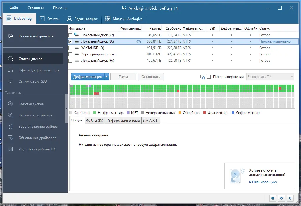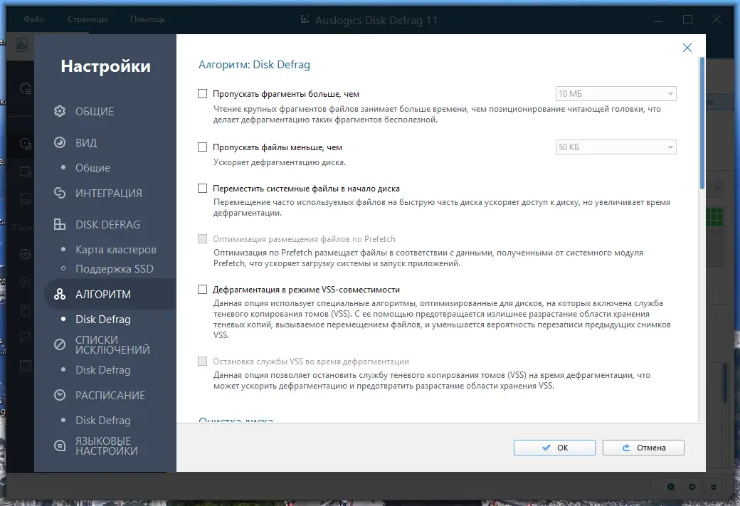 - Режимы дефрагментации: полная, быстрая, интеллектуальная