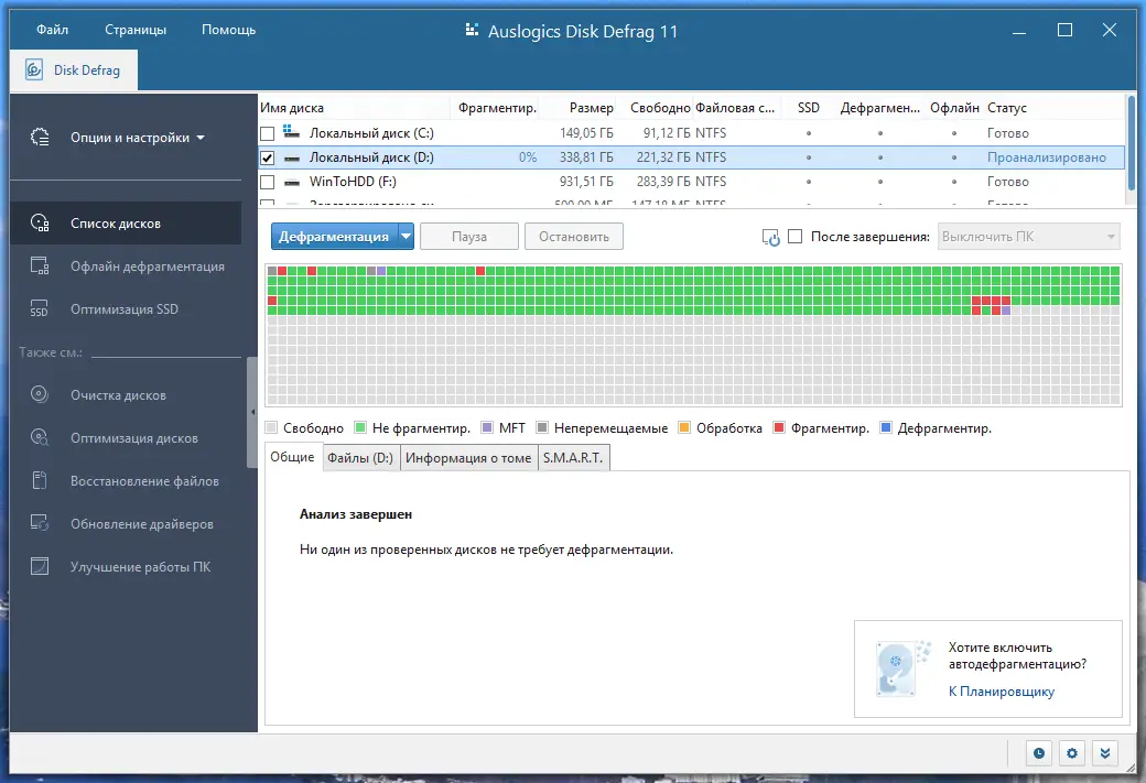 Работа с Auslogics Disk Defrag