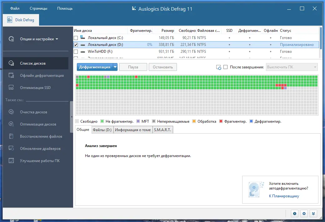 Auslogics Disk Defrag — это высокоскоростной дефрагментатор диска, предназначенный для повышения производительности жёстких дисков и продления их срока службы. Программа поддерживает современные файловые системы и предлагает продвинутые алгоритмы оптимизации, включая специальные режимы для SSD и системных файлов. Благодаря интуитивному интерфейсу и минимальным требованиям к ресурсам, она подходит как для новичков, так и для опытных пользователей.