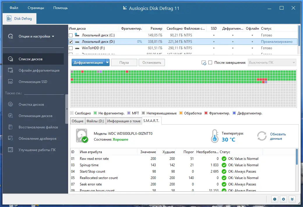 Регулярное использование дефрагментатора помогает не только ускорить работу диска, но и снизить износ механических компонентов за счёт уменьшения перемещений головок чтения.
