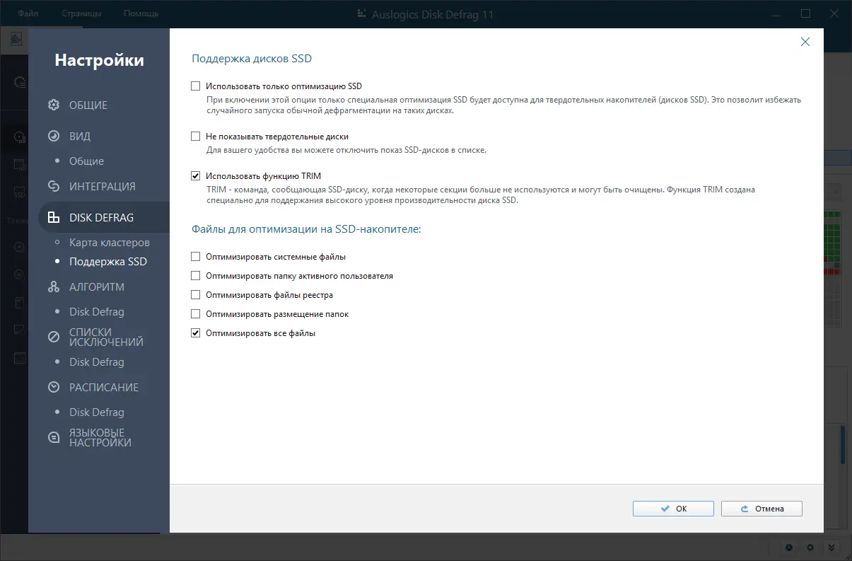- Предлагает четыре режима оптимизации: полная дефрагментация, ускоренная дефрагментация, оптимизация для SSD и режим VSS