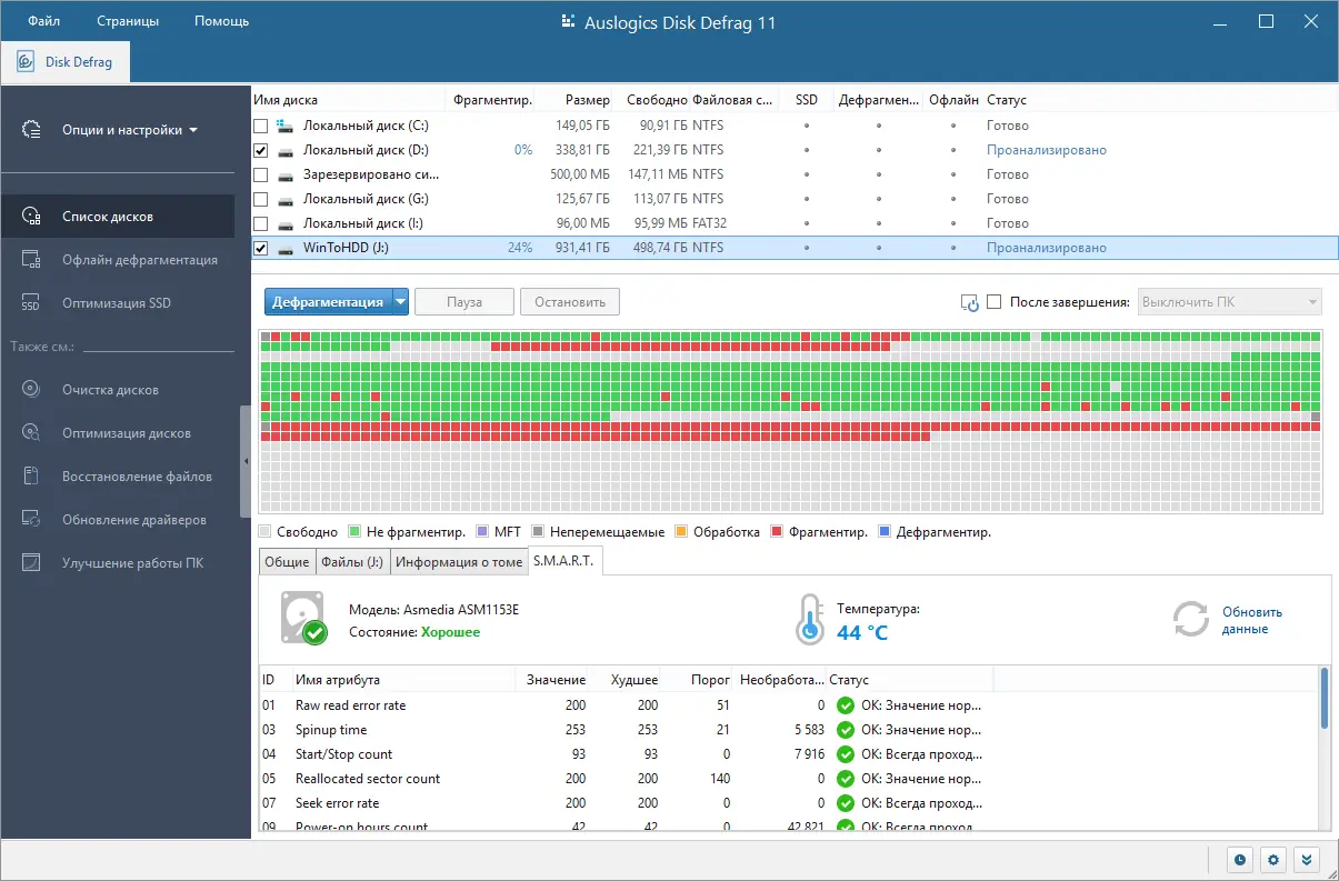 Auslogics Disk Defrag — это высокопроизводительный дефрагментатор дисков, разработанный для повышения скорости работы жёсткого диска и оптимизации файловой системы. Программа поддерживает как классические HDD, так и современные SSD, обеспечивая стабильную производительность системы без необходимости в аппаратной модернизации. Благодаря эффективным алгоритмам дефрагментации, инструмент ускоряет загрузку операционной системы, приложений и доступ к файлам.