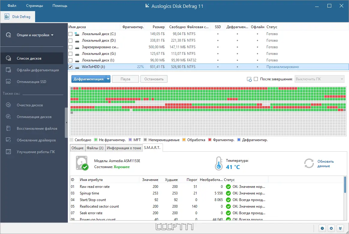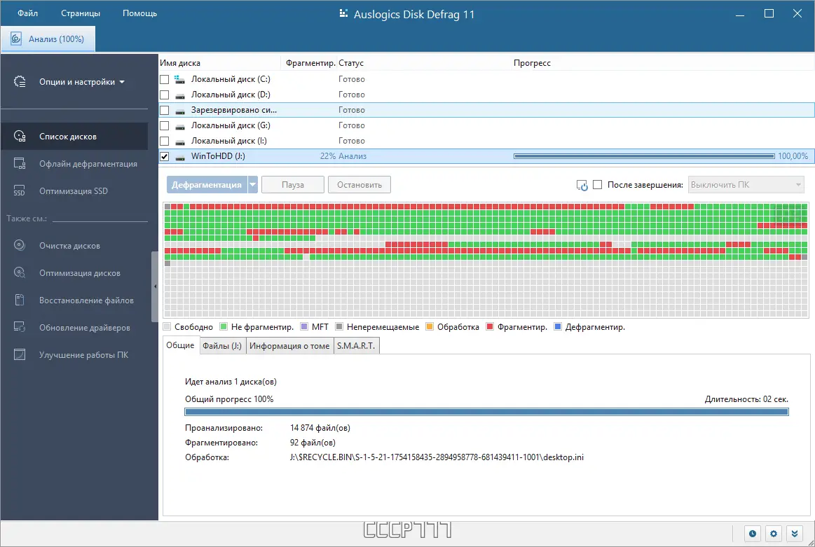 - Высокая скорость обработки даже на сильно фрагментированных дисках