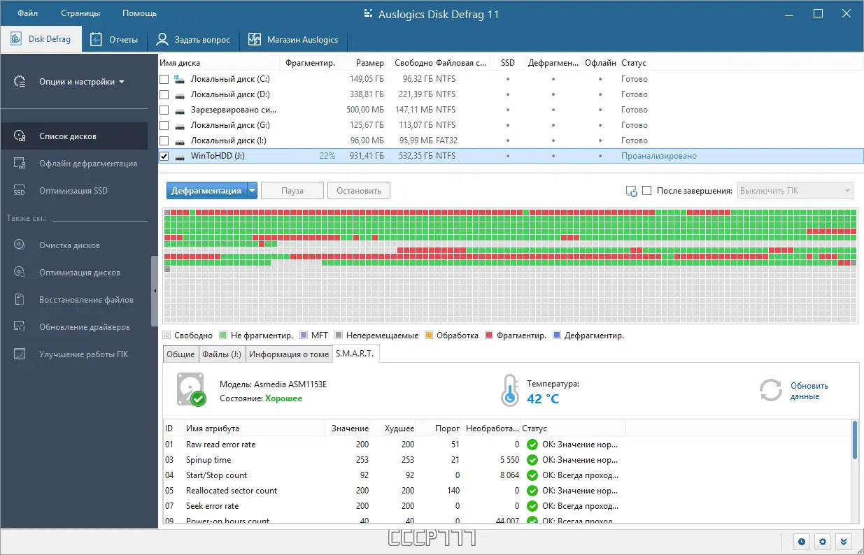 - Мониторит производительность диска, предоставляя пользователю данные о скорости чтения и состоянии фрагментации.