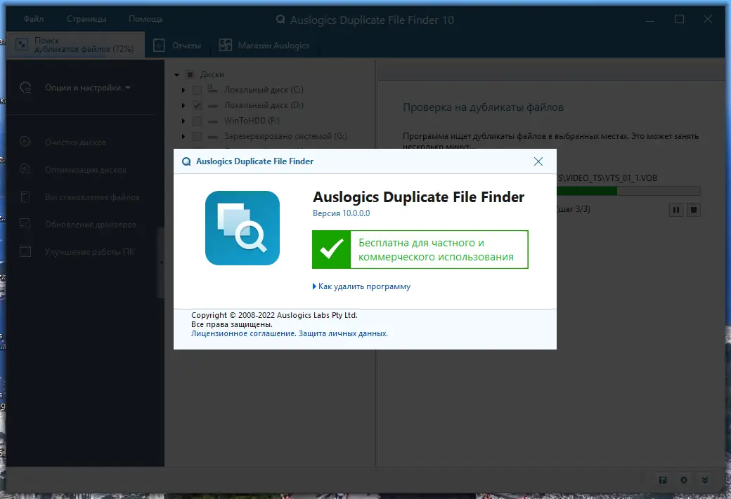 Auslogics Duplicate File Finder — бесплатная утилита для поиска и удаления дублирующихся файлов на жёстком диске. Программа анализирует содержимое накопителей, выявляя копии документов, изображений, музыки и других типов файлов, что позволяет освободить значительный объём дискового пространства и улучшить организацию данных.