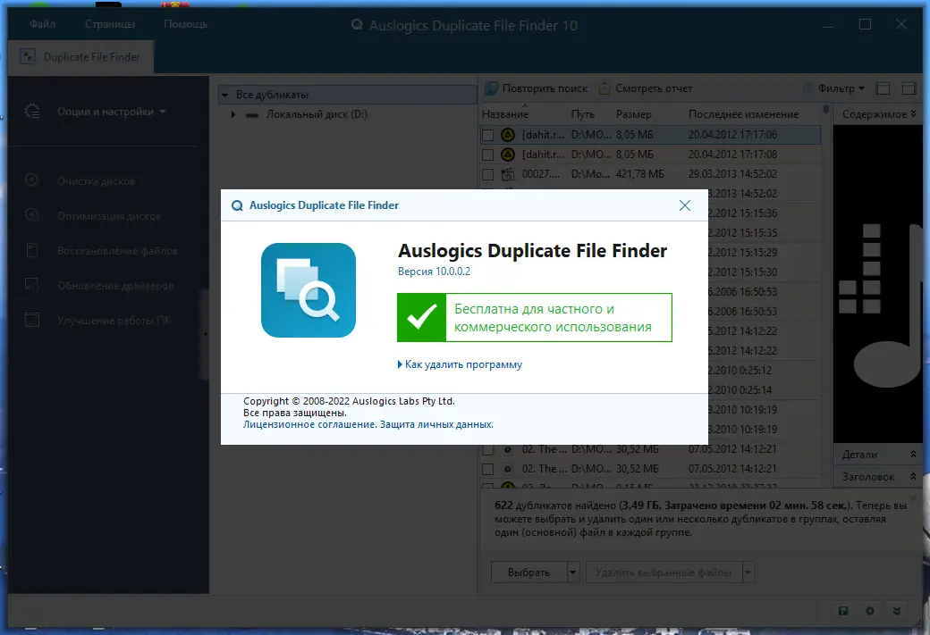 Auslogics Duplicate File Finder — это эффективная утилита для поиска и удаления дублирующихся файлов на жёстком диске, способная освободить до половины занимаемого пространства. Программа анализирует содержимое файлов, а не только их имена, что позволяет точно выявлять полные копии любых типов данных, включая документы, изображения, аудио и видео.